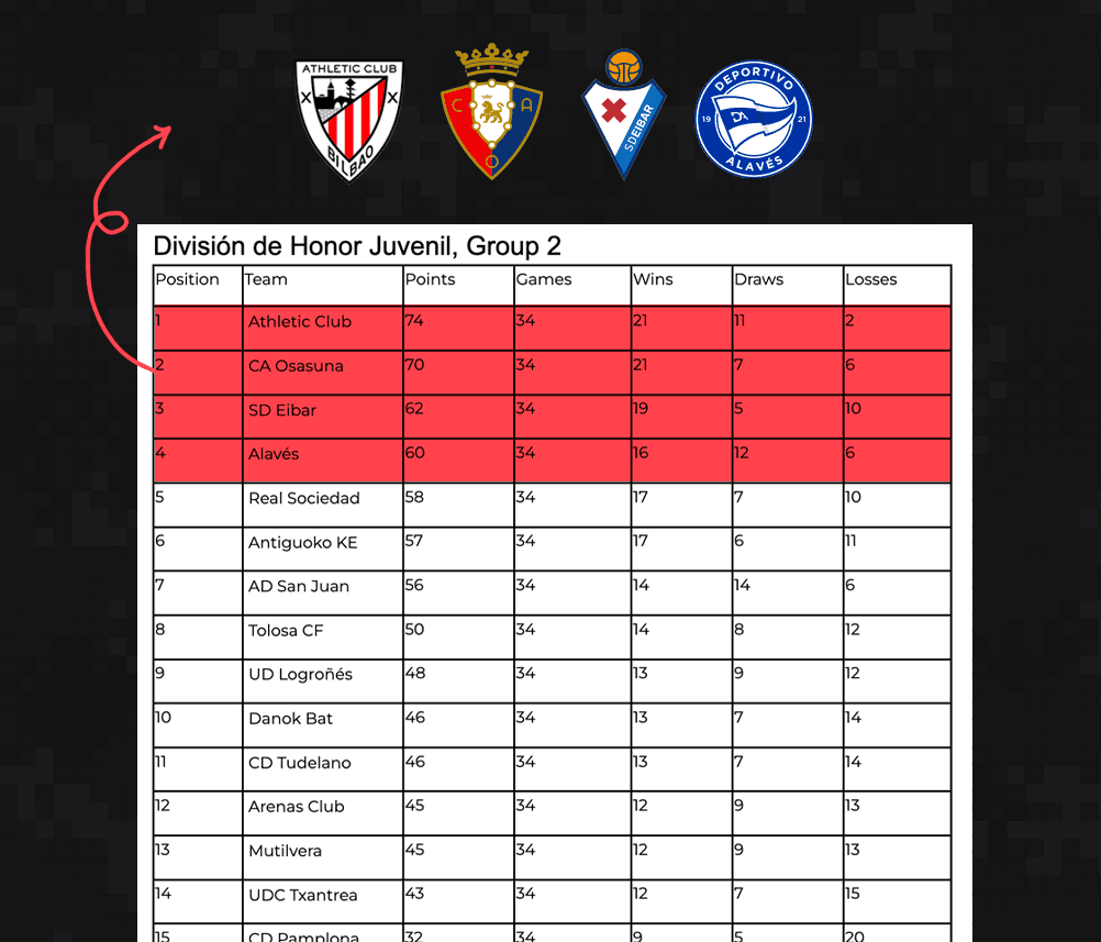 In Group 2 of División de Honor Juvenil, Spain’s highest level competition for U19 teams, the top four teams all use Bepro.
