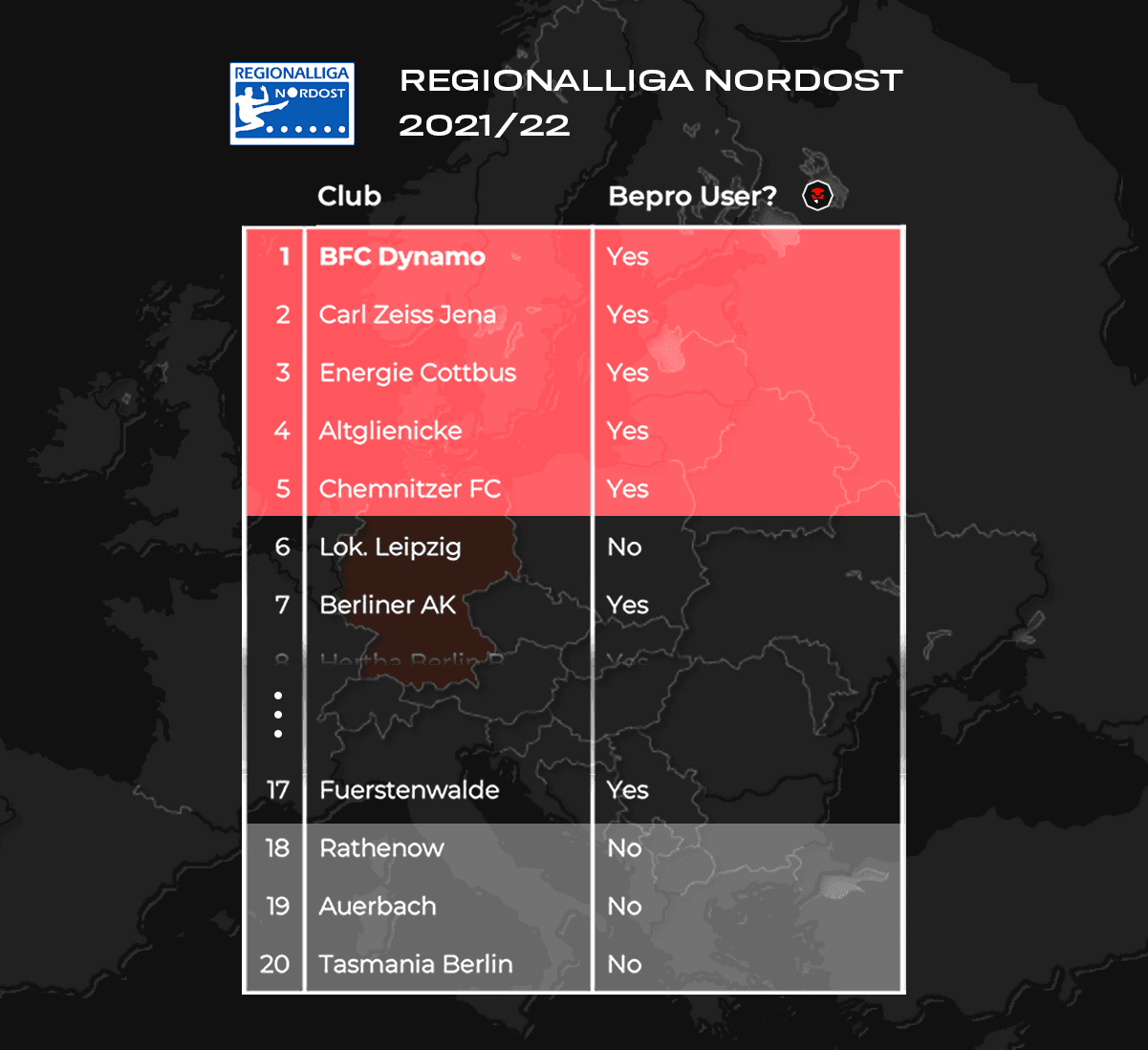 Reviewing the final 21/22 league positions, none of the bottom three sides use Bepro, but all of the top five do, including Berliner FC Dynamo, who won the league but unfortunately missed out on promotion to 3. Liga by a single goal, losing in the promotion playoffs.